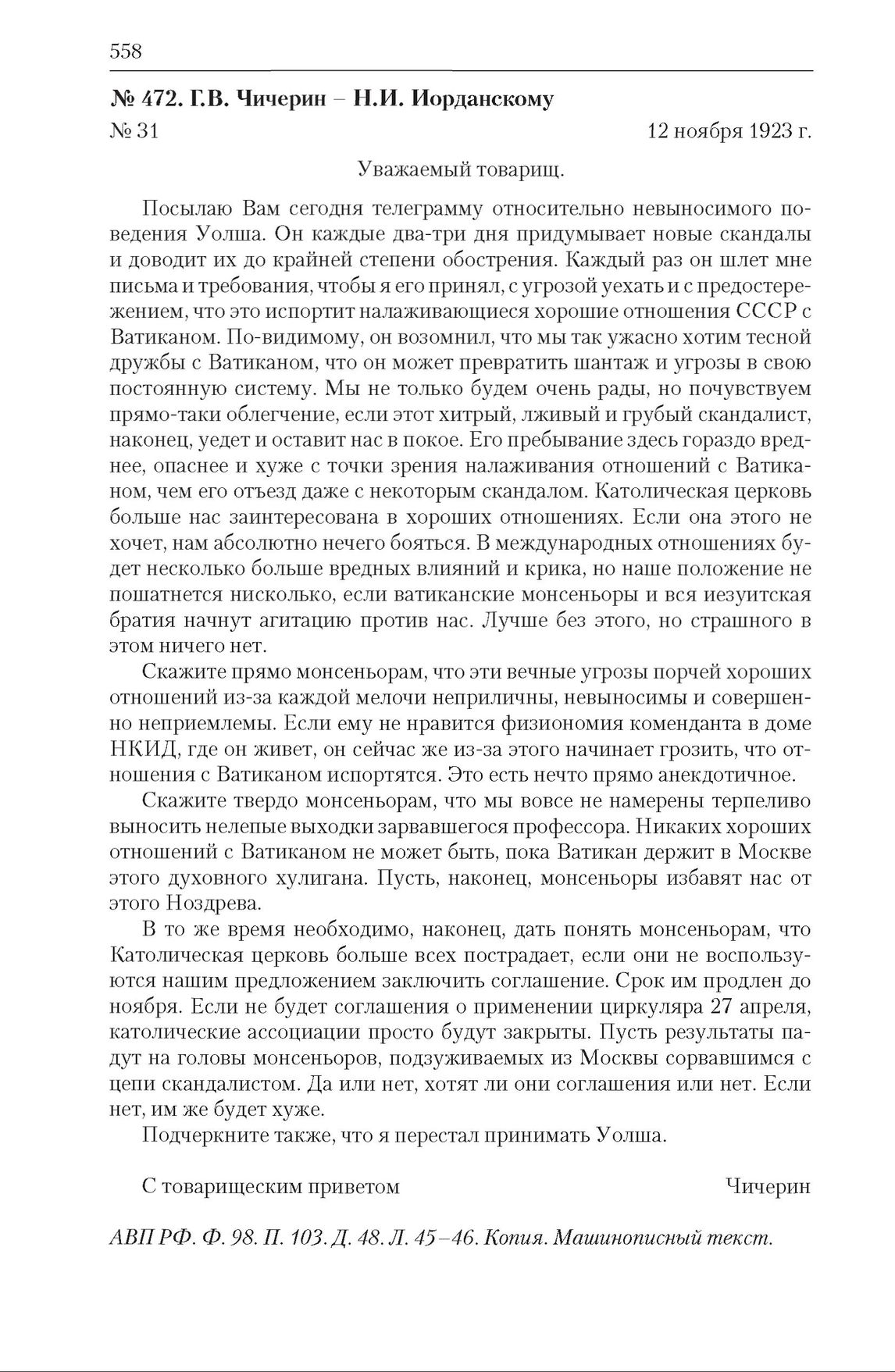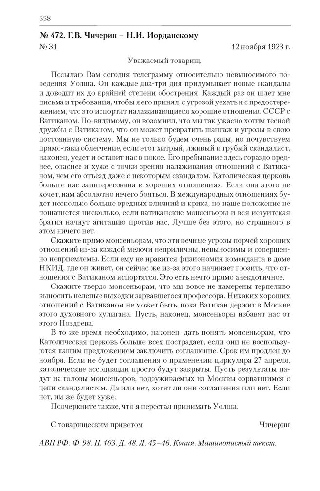Письмо Г. В. Чичерина – Н. И. Иорданскому о положении Католической церкви в РСФСР. 12 ноября 1923 г. // АВП РФ. Ф. 98. П. 103. Д. 48. Л. 45–46. Копия. Машинописный текст. Опубликовано: «Отношения с Ватиканом должны быть урегулированы». Из переписки наркома иностранных дел Г. В. Чичерина. 1920–1928 гг. Публ. М. И. Одинцова и А. А. Чернобаева. Исторический архив. 2005. № 1. С. 66–67.