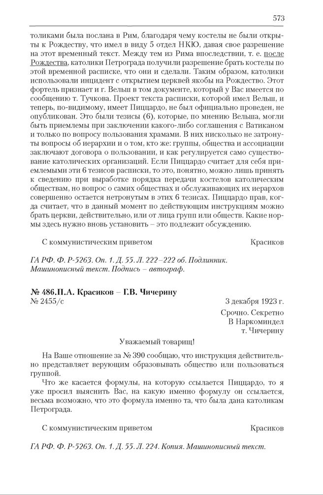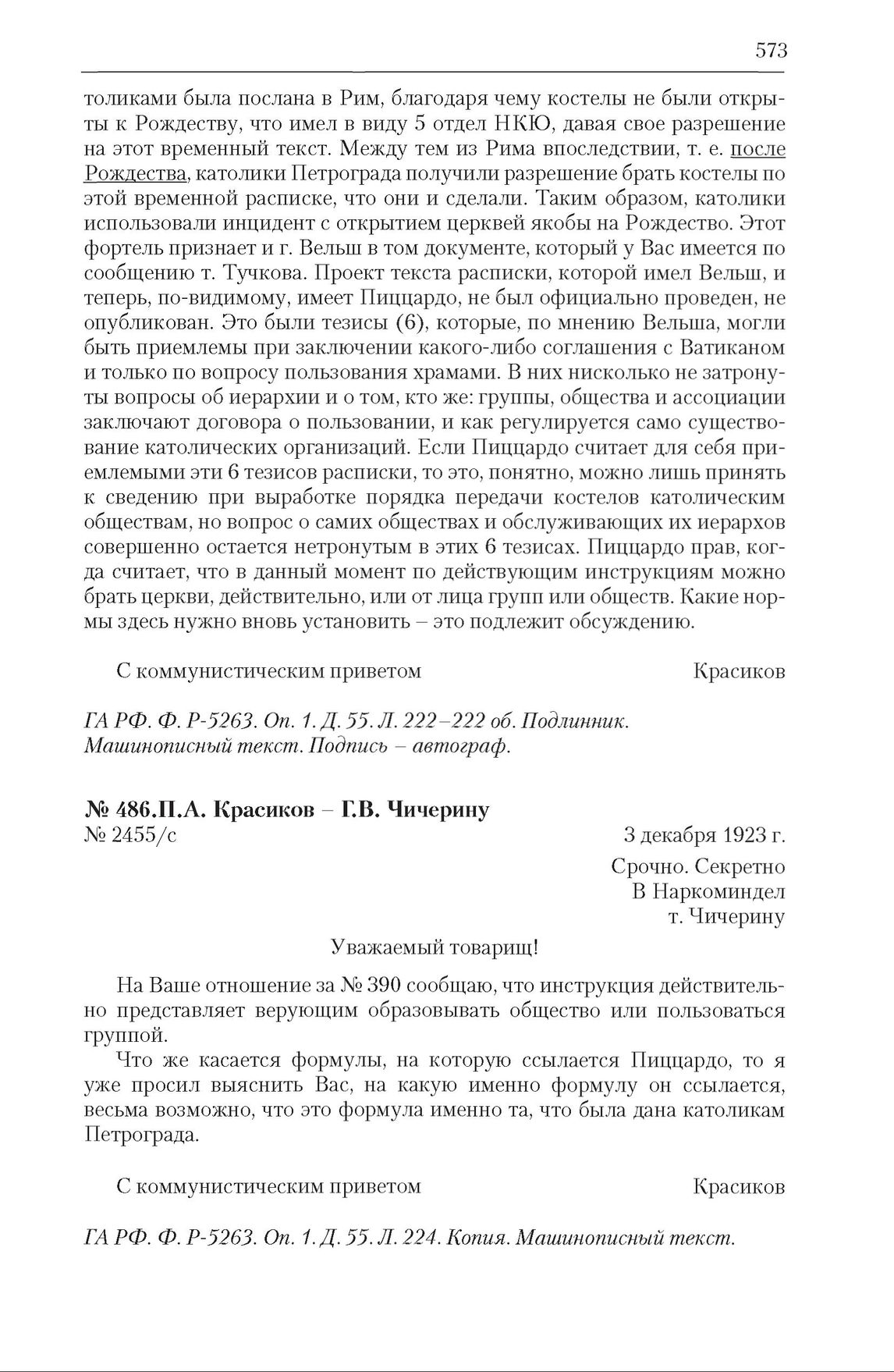 Письмо П. А. Красикова – Г. В. Чичерину по вопросам российско-ватиканских отношений и положения Католической церкви в РСФСР. 3 декабря 1923 г. // ГА РФ. Ф. Р-5263. Оп. 1. Д. 55. Л. 224. Копия. Машинописный текст.