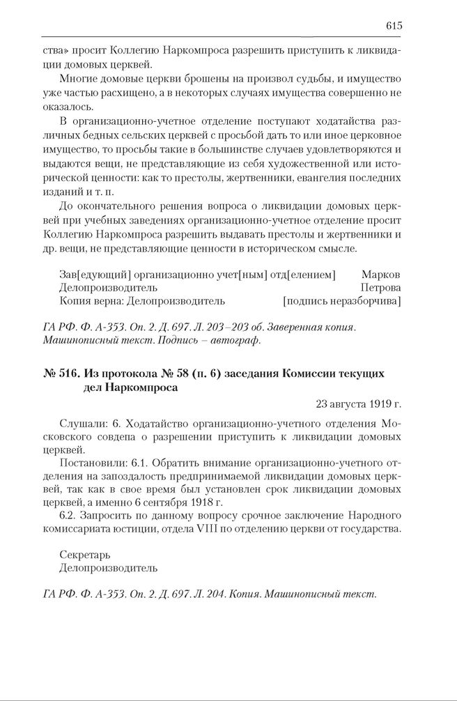 Из протокола № 58 (п. 6) заседания Комиссии текущих дел Наркомпроса РСФСР по вопросам ликвидации домовых церквей при государственных учебных учреждениях. 23 августа 1919 г. // ГА РФ. Ф. А-353. Оп. 2. Д. 697. Л. 204. Копия. Машинописный текст.