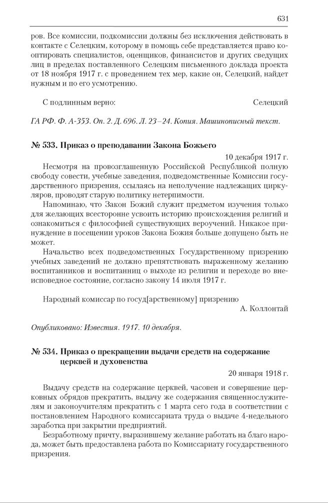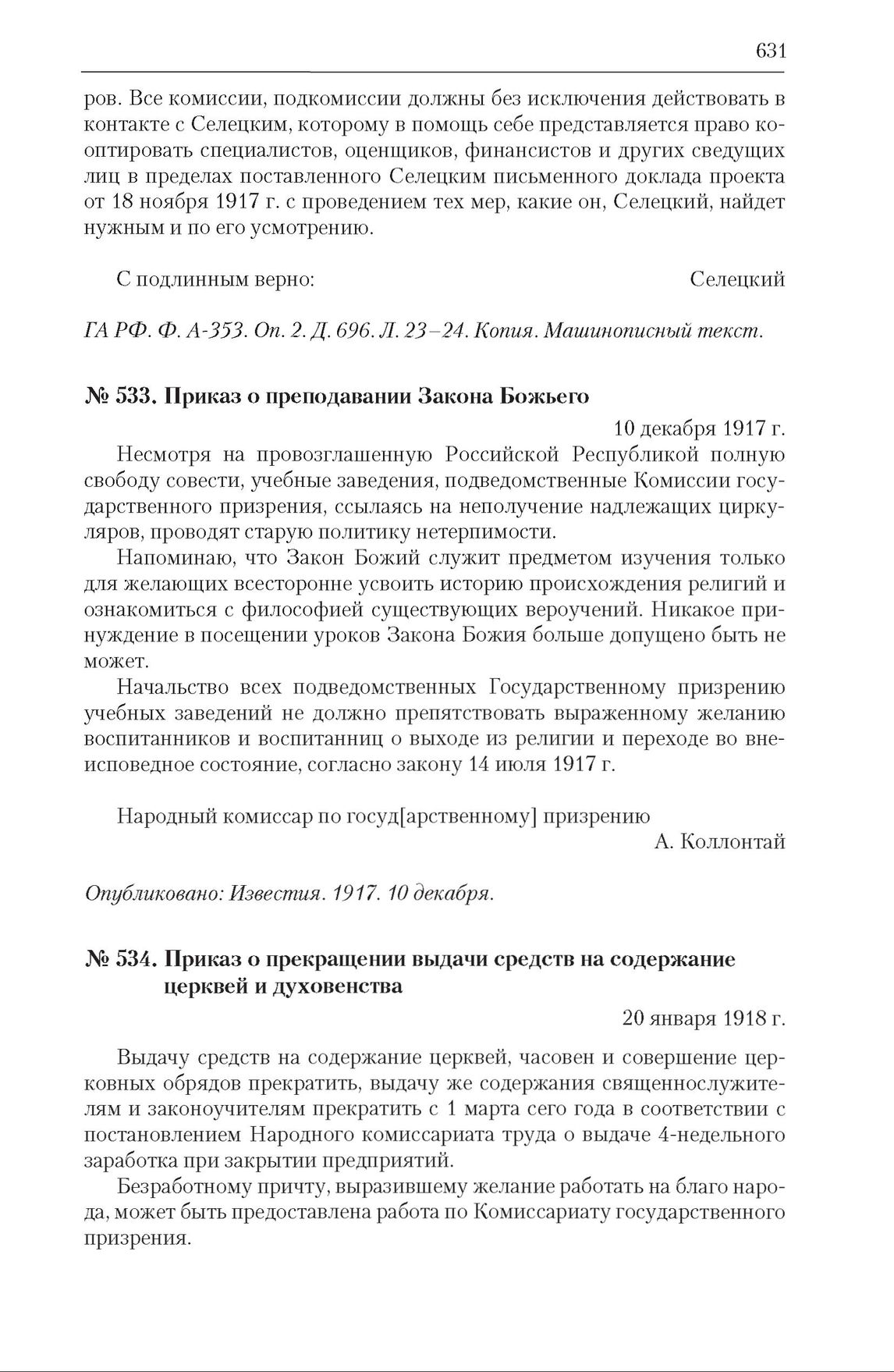 Приказ Народного комиссариата государственного призрения РСФСР о преподавании Закона Божьего. 10 декабря 1917 г. // Опубликовано: Известия. 1917. 10 декабря.
