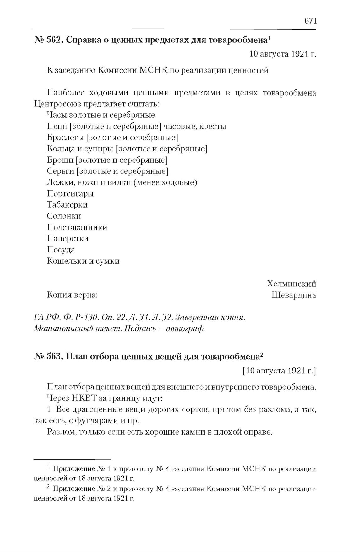 План Комиссии по реализации хранящихся в Наркомфине РСФСР ценностей отбора ценных вещей для товарообмена. 10 августа 1921 г. // ГА РФ. Ф. Р-130. Оп. 22. Д. 31. Л. 33. Заверенная копия. Машинописный текст. Подпись – автограф.