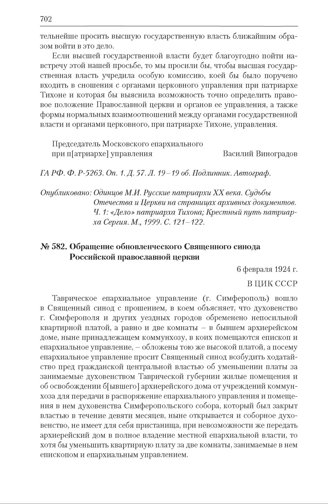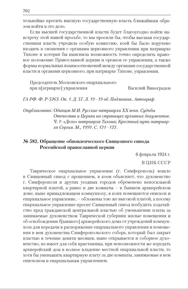 Конфессиональная политика советского государства. 1917—1991 гг. : Документы и материалы : в 6 т. Т. 1 : в 4 кн. : 1917-1924 гг. Кн. 3 : Народные комиссариаты СНК РСФСР (1917-1924) и СНК СССР (1922-1924): проведение в жизнь декрета «Об отделении церкви от государства и школы от церкви» — М. : Политическая энциклопедия, 2018.