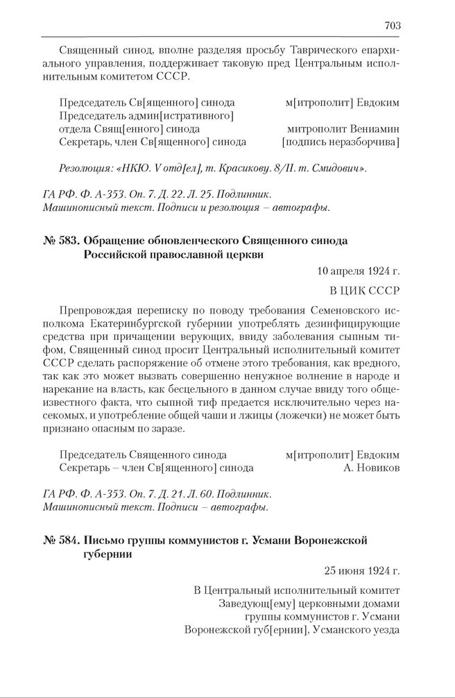 Обращение обновленческого Священного синода Российской православной церкви. 10 апреля 1924 г. // ГА РФ. Ф. А-353. Оп. 7. Д. 21. Л. 60. Подлинник. Машинописный текст. Подписи – автографы.