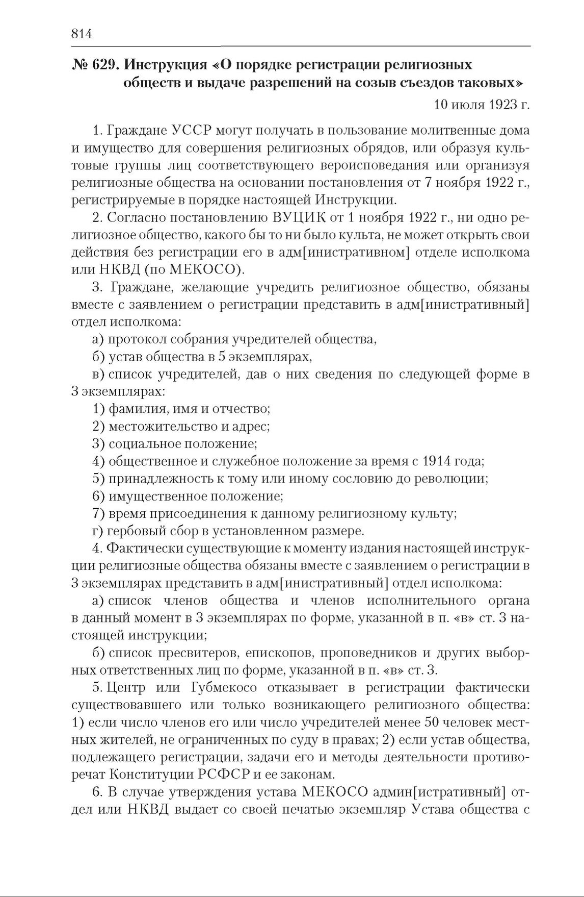 Инструкция НКВД УССР «О порядке регистрации религиозных обществ и выдаче разрешений на созыв съездов таковых». 10 июля 1923 г.
