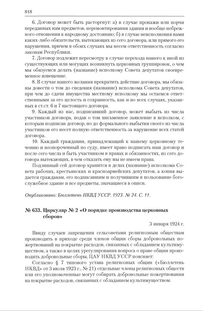 Циркуляр НКВД УССР № 2 «О порядке производства церковных сборов». 3 января 1924 г. // Опубликовано: Бюллетень НКВД УССР. 1924. № 1. Печатается по: Гидулянов П. В. Отделение церкви от государства в СССР: Полный сборник декретов, ведомственных распоряжений и определений Верховного Суда РСФСР и других социалистических республик. М., 1926. С. 233.