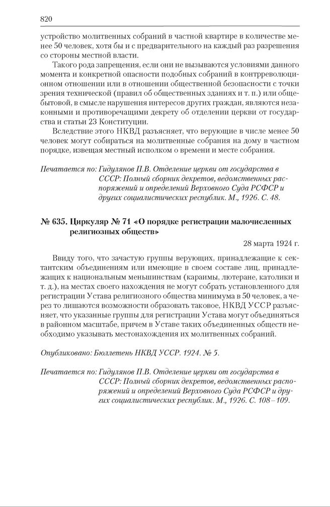 Циркуляр НКВД УССР № 71 «О порядке регистрации малочисленных религиозных обществ». 28 марта 1924 г. // Опубликовано: Бюллетень НКВД УССР. 1924. № 5. Печатается по: Гидулянов П. В. Отделение церкви от государства в СССР: Полный сборник декретов, ведомственных распоряжений и определений Верховного Суда РСФСР и других социалистических республик. М., 1926. С. 108–109.