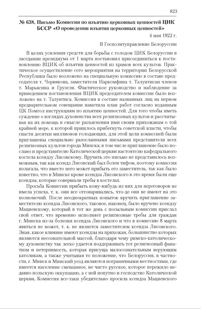 Письмо Комиссии по изъятию церковных ценностей ЦИК БССР «О проведении изъятия церковных ценностей». 4 мая 1922 г. // ГА РФ. Ф. А-353. Оп. 6. Д. 15. Л. 59–61 об. Копия. Машинописный текст.