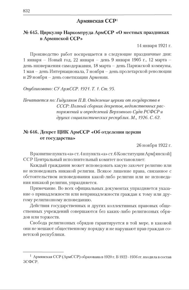 Циркуляр Наркомтруда АрмССР «О местных праздниках в Армянской ССР». 14 января 1921 г. // Опубликовано: СУ АрмССР. 1921. Т. 1. Ст. 95. Печатается по: Гидулянов П. В. Отделение церкви от государства в СССР: Полный сборник декретов, ведомственных распоряжений и определений Верховного Суда РСФСР и других социалистических республик. М., 1926. С. 62.