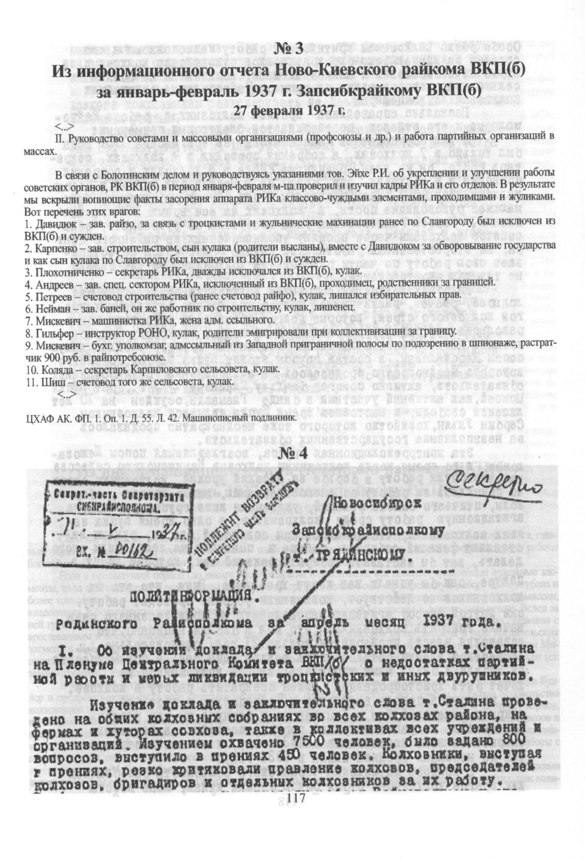 Из информационного отчета Ново-Киевского райкома ВКП(б) за январь-февраль 1937 г. Запсибкрайкому ВКП(б). 27 февраля 1937 г. // ЦХАФ АК. ФП. 1. Оп. 1. Д. 55. Л. 42. Машинописный подлинник.