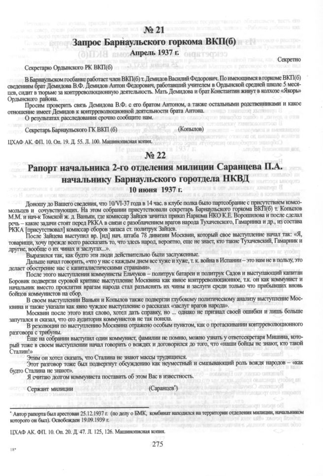 Рапорт начальника 2-го отделения милиции г. Барнаула Саранцева П.А. начальнику Барнаульского горотдела НКВД. 10 июня 1937 г. // ЦХАФ АК. ФП. 10. Оп. 20. Д. 47. Л. 125,126. Машинописная копия.