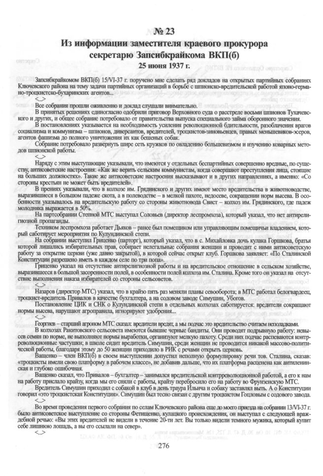 Из информации заместителя краевого прокурора секретарю Запсибкрайкома ВКП(б) о проведении партийных собраний в Ключевском районе. 25 июня 1937 г. // ГАНО. ФР. 20. Оп. 1. Д. 233. Л. 16-24. Машинописная копия.