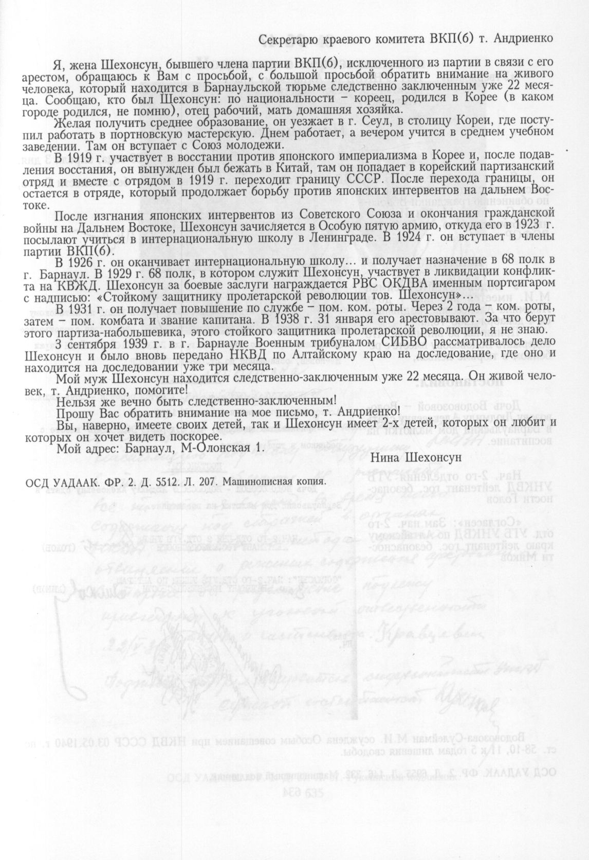 Письмо жены Ше Хан Сун Нины Шехонсун секретарю Алтайского крайкома ВКП(б). [1939 г.] // ОСД УАДААК. ФР. 2. Д. 5512. Л. 207. Машинописная копия.
