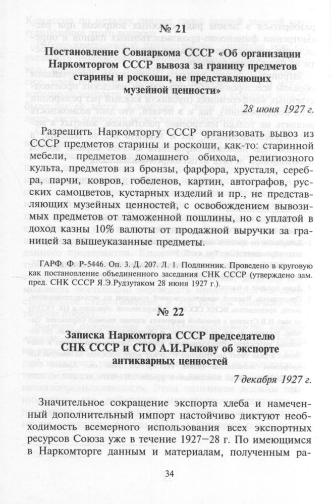 Постановление Совнаркома СССР «Об организации Наркомторгом СССР вывоза за границу предметов старины и роскоши, не представляющих музейной ценности». 28 июня 1927 г. // ГА РФ. Ф. Р-5446. Оп. 3. Д. 207. Л. 1. Подлинник. Проведено в круговую как постановление объединенного заседания СНК СССР (утверждено зам. пред. СНК СССР Я.Э.Рудзутаком 28 июня 1927 г.).
