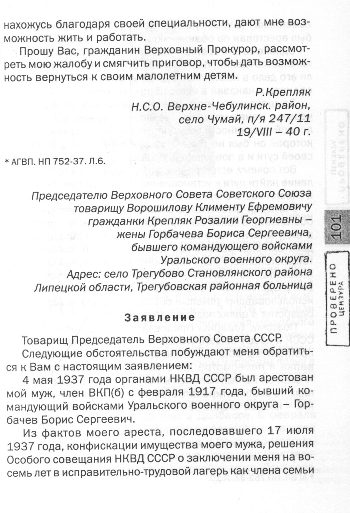 Горбачев Борис Сергеевич. Заявление Р. Г. Крепляк на имя К. Е. Ворошилова от 10 февраля 1955 г.