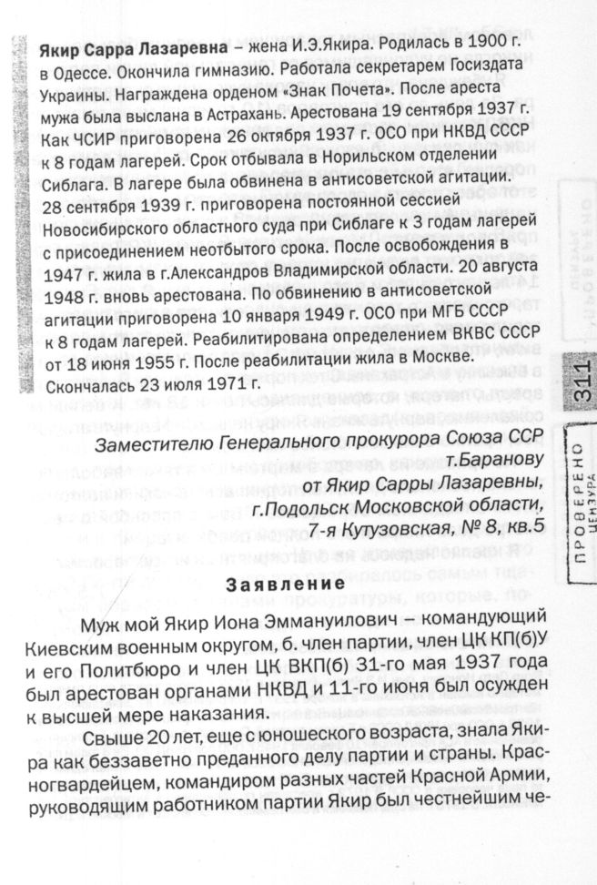 Якир Иона Эммануилович. Заявление С. Л. Якир на имя П. В. Баранова от 7 мая 1955 г. // АГВП. НП 240-37-центр. Т.3. Л.135-136.