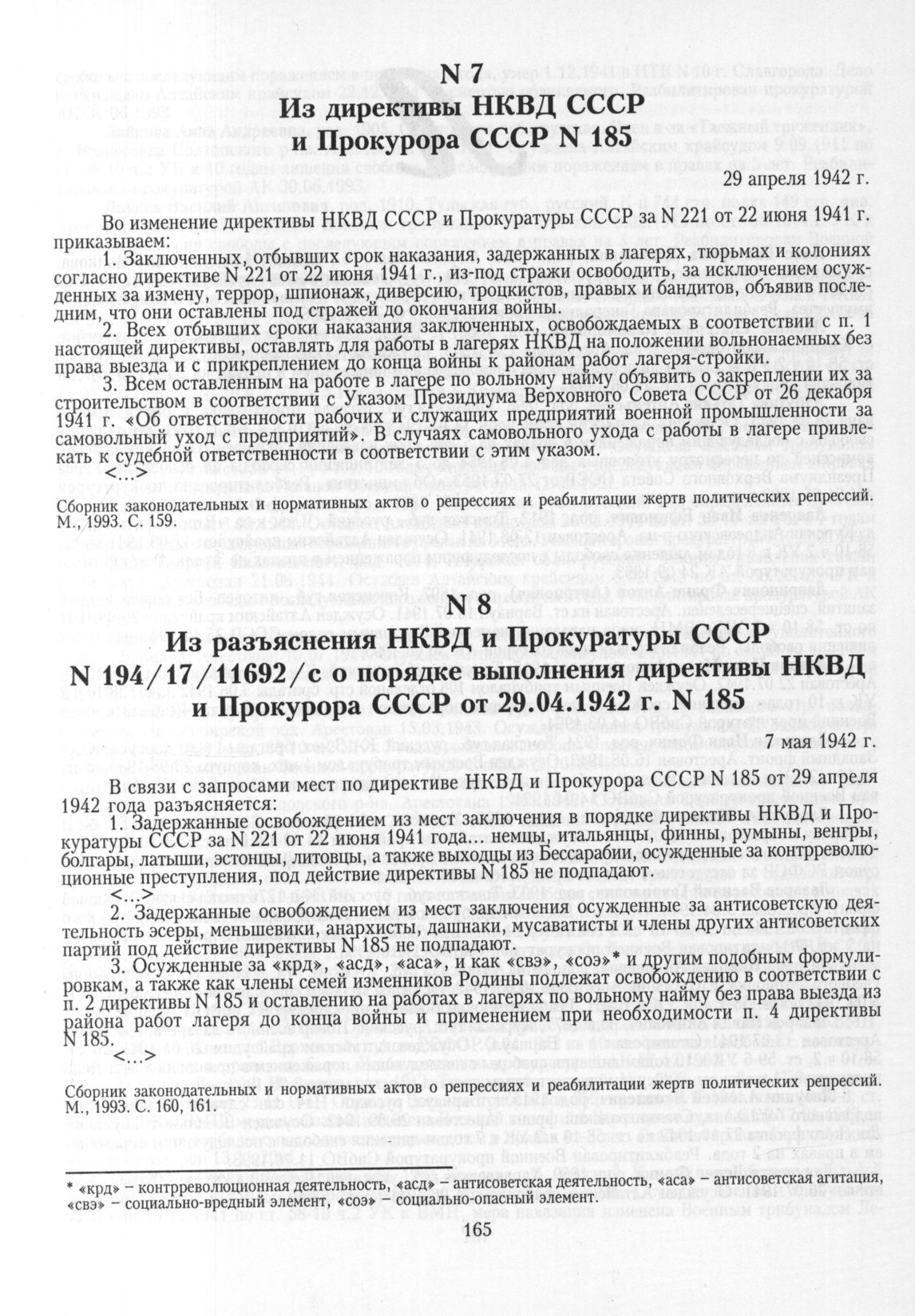 Из директивы НКВД и Прокурора СССР № 185. 29 апреля 1942 г. // Сборник законодательных и нормативных актов о репрессиях и реабилитации жертв политических репрессий. М., 1993. С. 159.