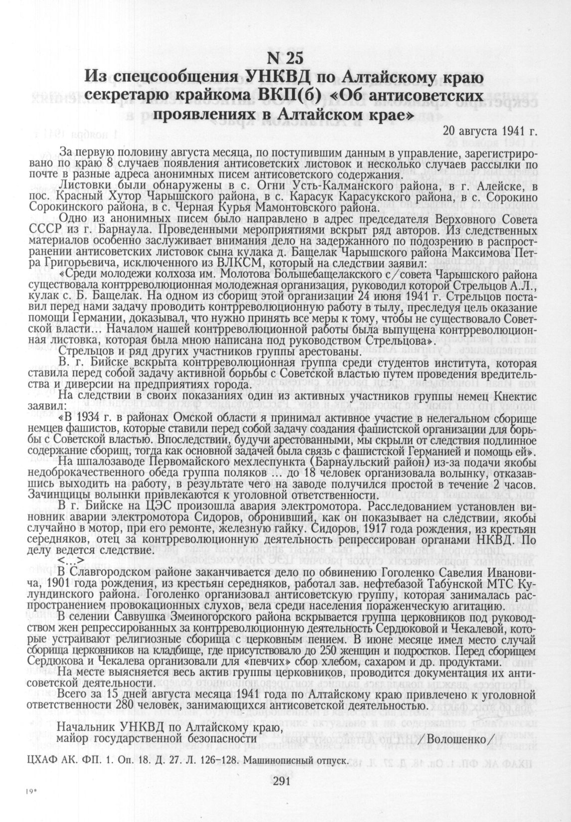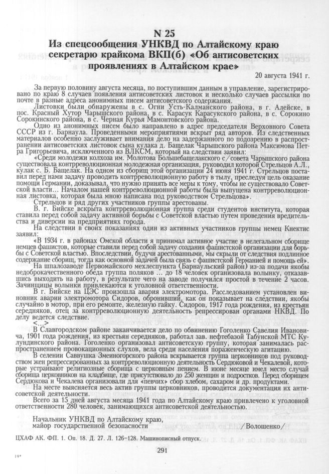 Из спецсообщения УНКВД по Алтайскому краю секретарю крайкома ВКП(б) «Об антисоветских проявлениях в Алтайском крае». 20 августа 1941 г. // ЦХАФ АК. ФП. 1. Оп. 18. Д. 27. Л. 126-128. Машинописный отпуск.