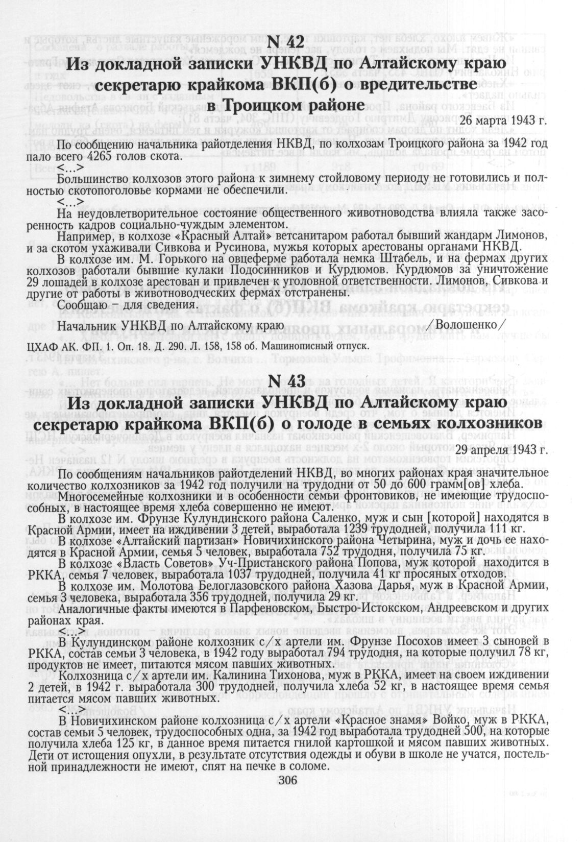 Из докладной записки УНКВД по Алтайскому краю секретарю крайкома ВКП(б) о голоде в семьях колхозников. 29 апреля 1943 г. // ЦХАФ АК. ФП. 1. Оп. 18. Д. 290. Л. 548, 549, 554. Машинописный отпуск.