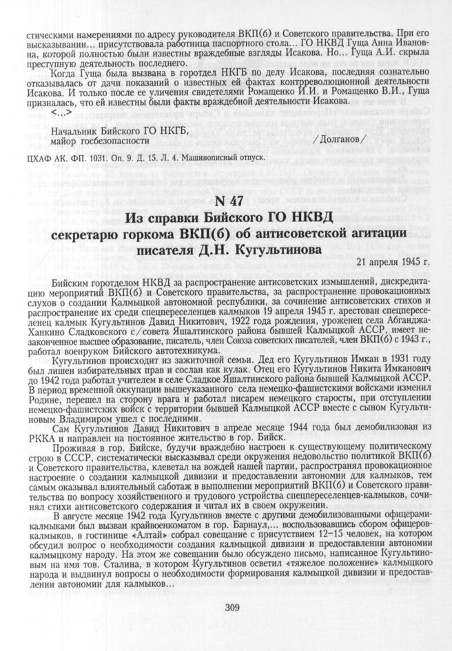 Из справки Бийского ГО НКВД секретарю горкома ВКП(б) об антисоветской деятельности писателя Д.Н. Кугультинова. 21 апреля 1945 г. // ЦХАФ АК. ФП. 1031. Оп. 9. Д. 15. Л. 37, 38. Машинописный отпуск.
