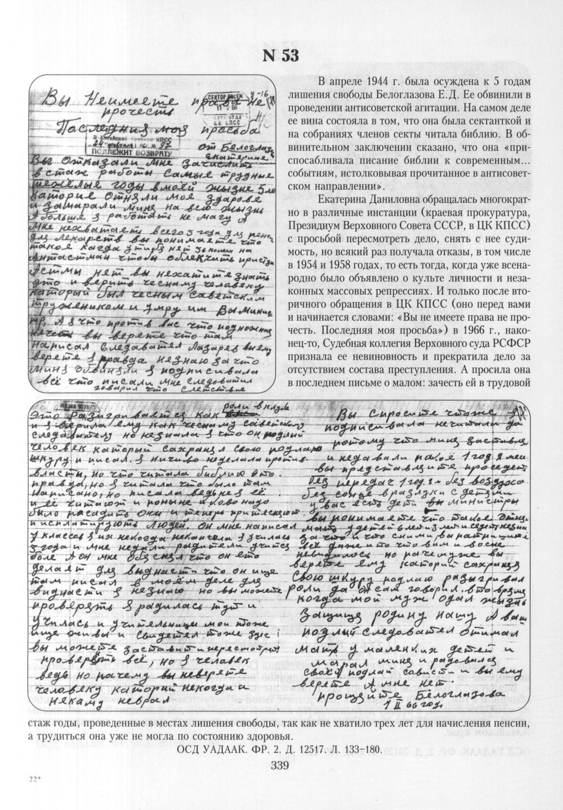 Письмо Белоглазовой Е.Д. в ЦК КПСС с просьбой зачесть в трудовой стаж годы, проведенные в местах лишения свободы. 1 февраля 1966 г. // ОСД УАДААК. ФР. 2. Д. 12517. Л. 133-180.