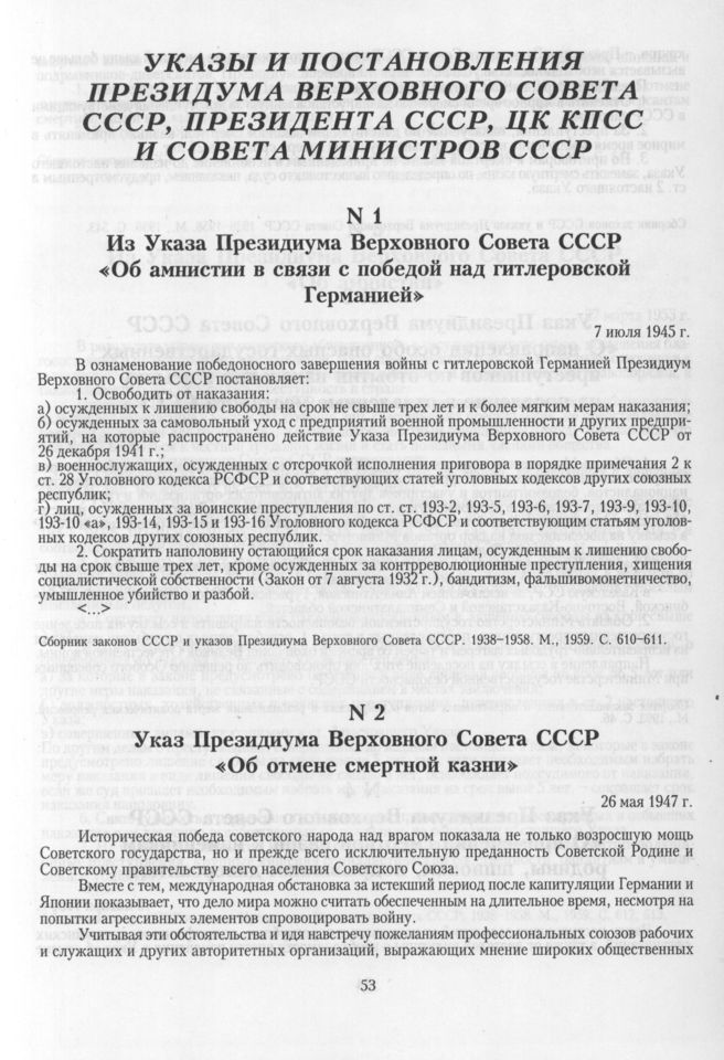 Указ Президиума Верховного Совета «Об отмене смертной казни». 26 мая 1947 г. // Сборник законов СССР и указов Президиума Верховного Совета СССР. 1938-1958. М., 1959. С. 543.