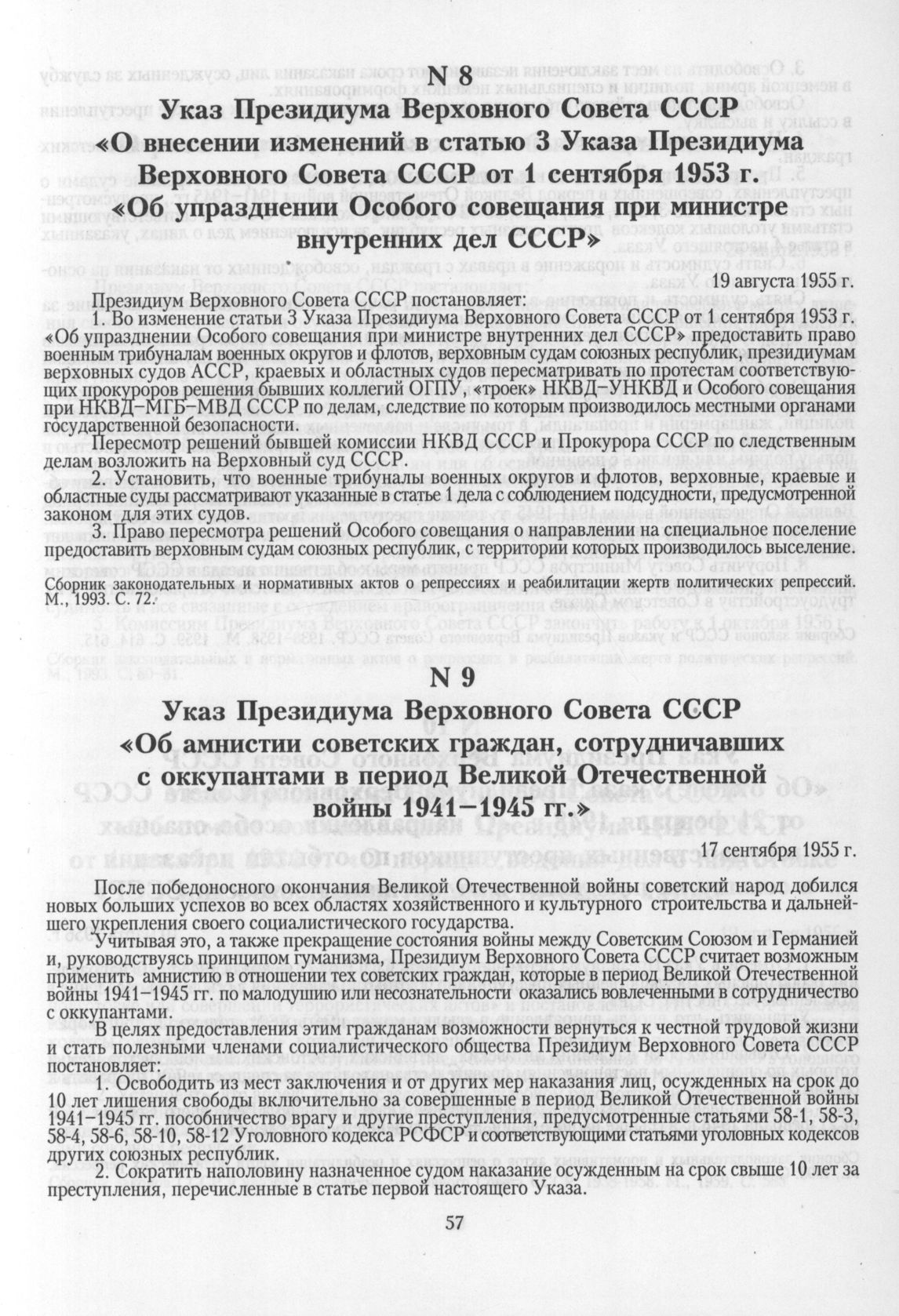 Указ Президиума Верховного Совета СССР «О внесении изменений в статью 3 Указа Президиума Верховного Совета СССР от 1 сентября 1953 г. «Об упразднении Особого совещания при министре внутренних дел». 19 августа 1955 г. // Сборник законодательных и нормативных актов о репрессиях и реабилитации жертв политических репрессий. М., 1993. С. 72.