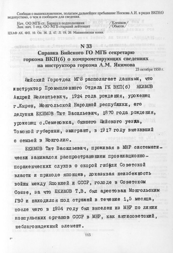 Справка Бийского ГО МГБ секретарю горкома ВКП(б) о компрометирующих сведениях на инструктора горкома А.М. Якимова. 23 октября 1950 г. // ЦХАФ АК. ФП. 1031. Оп. 18. Д. 22. Л. 18, 19. Машинописный отпуск.
