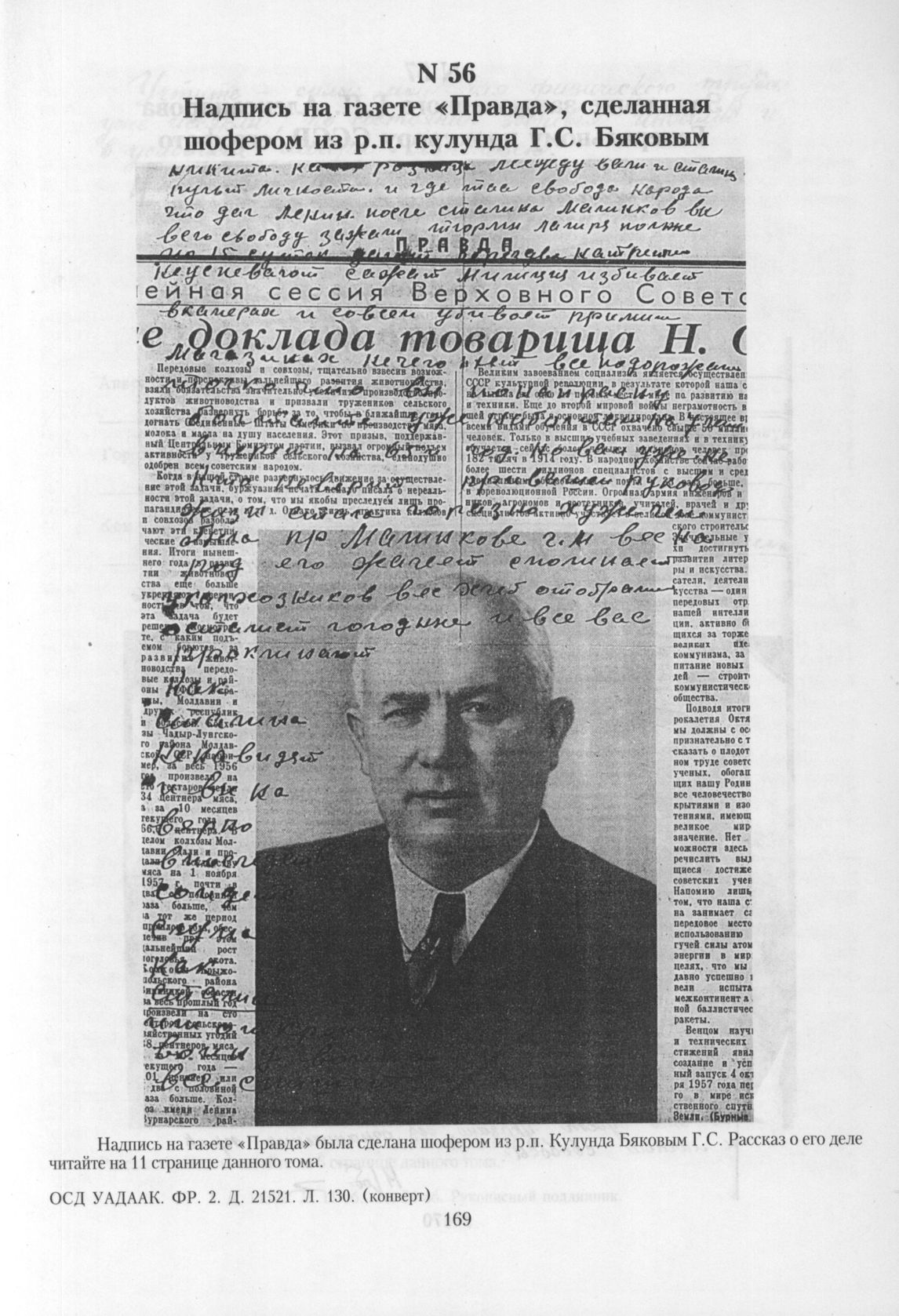 Надпись на газете «Правда», сделанная шофером из р.п. Кулунда Г.С. Бяковым // ОСД УАДААК. ФР. 2. Д. 21521. Л. 130. (конверт).