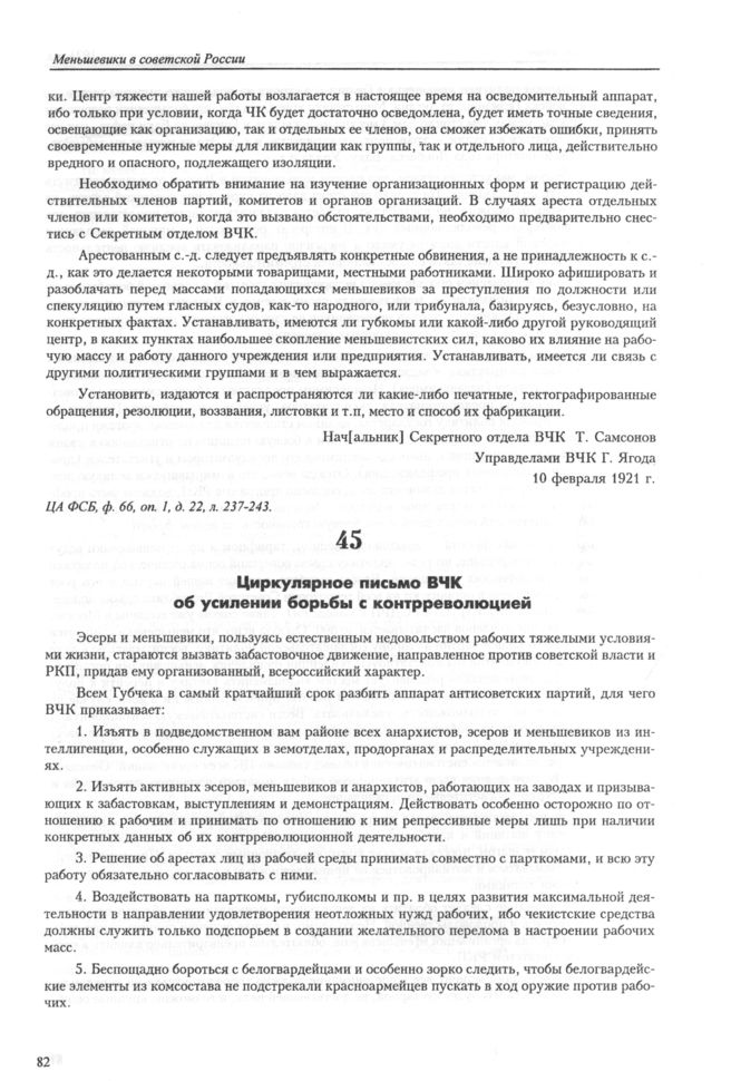 Циркулярное письмо ВЧК об усилении борьбы с контрреволюцией. 28 февраля 1921 г. // ЦА ФСБ, ф. 66, оп. 1, д. 2, л. 119-120.