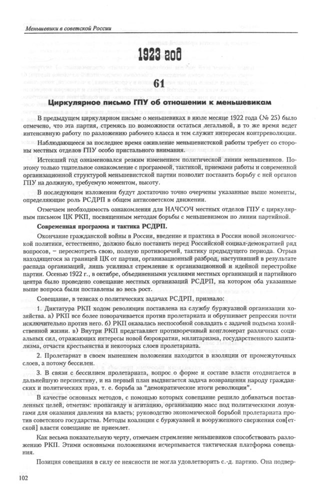 Циркулярное письмо ГПУ об отношении к меньшевикам. 30 августа 1923 г. // ЦА ФСБ, ф. 66, оп. 1, д. 26, л. 198-211.