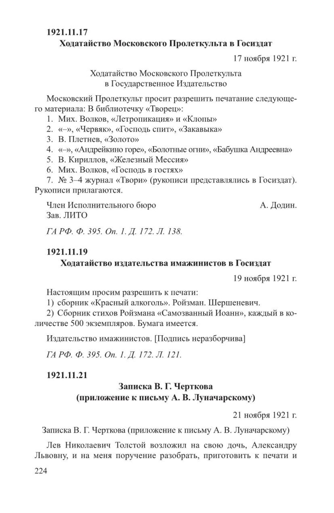 Записка В. Г. Черткова (приложение к письму А. В. Луначарскому). 21 ноября 1921 г. // ГА РФ. Ф. 2306. Оп. 1. Д. 1038. Л. 3 об–4. Копия. Записка сокращена. См. письмо А. Л. Толстой во ВЦИК РСФСР 21-XI-22 г.