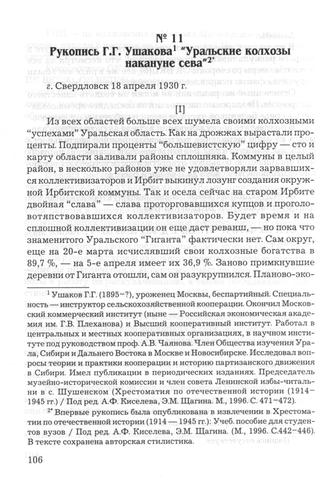 Рукопись Г.Г. Ушакова «Уральские колхозы накануне сева». 18 апреля 1930 г. // РГАЭ. Ф. 260. Oп. 1. Д. 6. Л. 174-184. Копия. Машинопись.