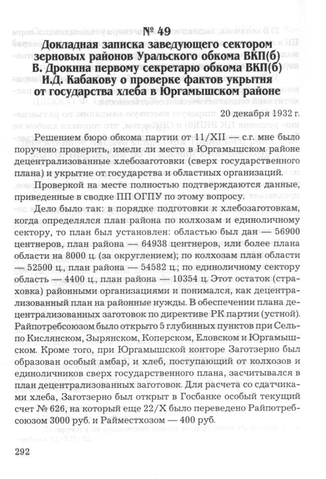 Докладная записка заведующего сектором зерновых районов Уральского обкома ВКП(б) В. Дронина первому секретарю обкома ВКП(б) И.Д. Кабакову о проверке фактов укрытия от государства хлеба в Юргамышском районе. 20 декабря 1932 г. // ГАСО. Ф. 88-р. Oп. 1. Д. 3305. Л. 302-304. Копия. Машинопись.