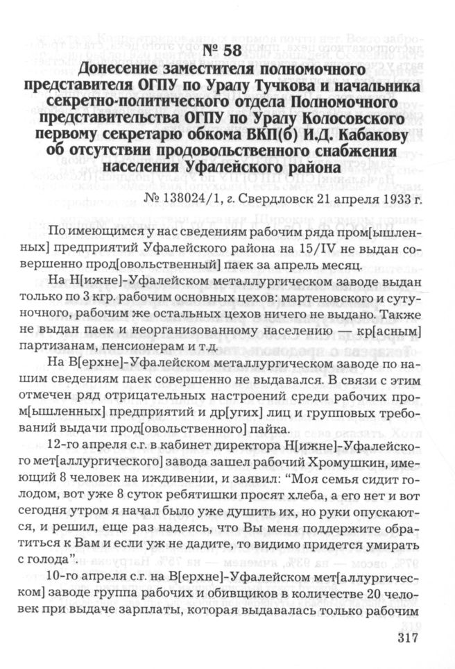 Донесение заместителя полномочного представителя ОГПУ по Уралу Тучкова и начальника секретно-политического отдела Полномочного представительства ОГПУ по Уралу Колосовского первому секретарю обкома ВКП(б) И.Д. Кабакову об отсутствии продовольственного снабжения населения Уфалейского района. 21 апреля 1933 г. // ЦДООСО. Ф. 4. Oп. 11. Д. 197. Л. 97. Подлинник. Машинопись.