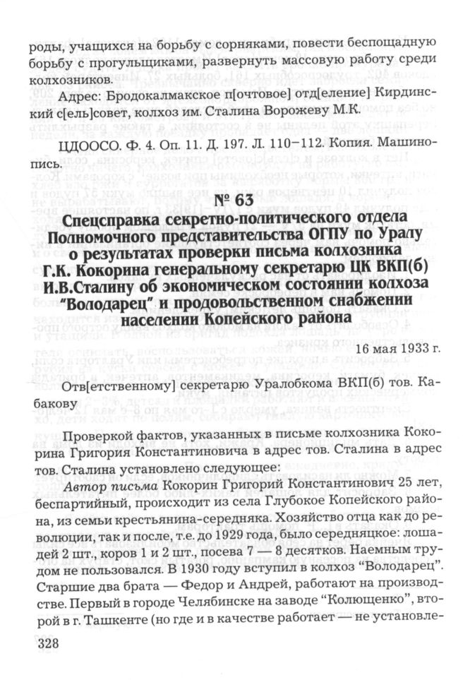 Спецсправка секретно-политического отдела Полномочного представительства ОГПУ по Уралу о результатах проверки письма колхозника Г.К. Кокорина генеральному секретарю ЦК ВКП(б) И.В.Сталину об экономическом состоянии колхоза «Володарец» и продовольственном снабжении населении Копейского района. 16 мая 1933 г. // ЦДООСО. Ф. 4. Оп. 11. Д. 197. Л. 113-116. Подлинник. Машинопись.