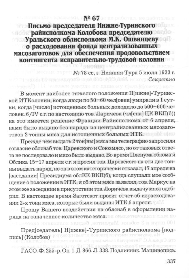 Письмо председателя Нижне-Туринского райисполкома Колобова председателю Уральского облисполкома М.К. Ошвинцеву о расходовании фонда централизованных мясозаготовок для обеспечения продовольствием контингента исправительно-трудовой колонии. 5 июля 1933 г. // ГАСО. Ф. 255-р. Oп. 1. Д. 866. Л. 338. Подлинник. Машинопись.