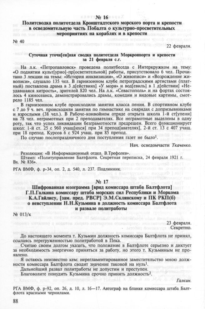 Политсводка политотдела Кронштадтского морского порта и крепости в осведомительную часть Побалта о культурно-просветительных мероприятиях на кораблях и в крепости. 22 февраля // РГА ВМФ, ф. р-34, оп. 2, д. 540, л. 237. Подлинник.