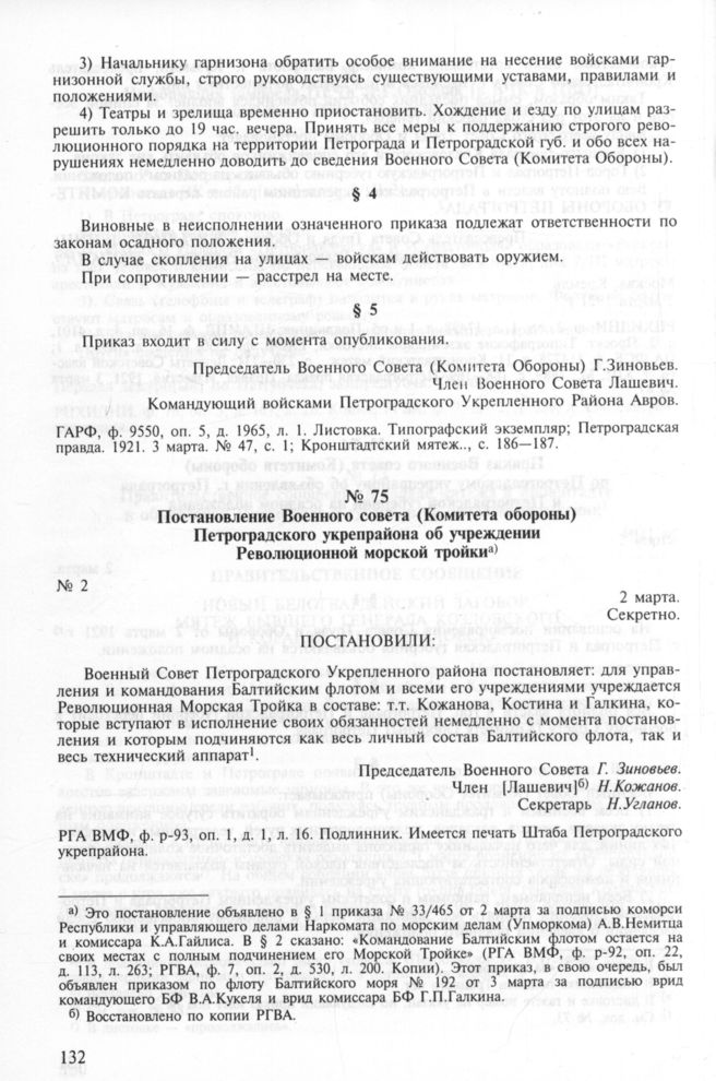 Постановление Военного совета (Комитета обороны) Петроградского укрепрайона об учреждении Революционной морской тройки. 2 марта // РГА ВМФ, ф. р-93, оп. 1, д. 1, л. 16. Подлинник. Имеется печать Штаба Петроградского укрепрайона.
