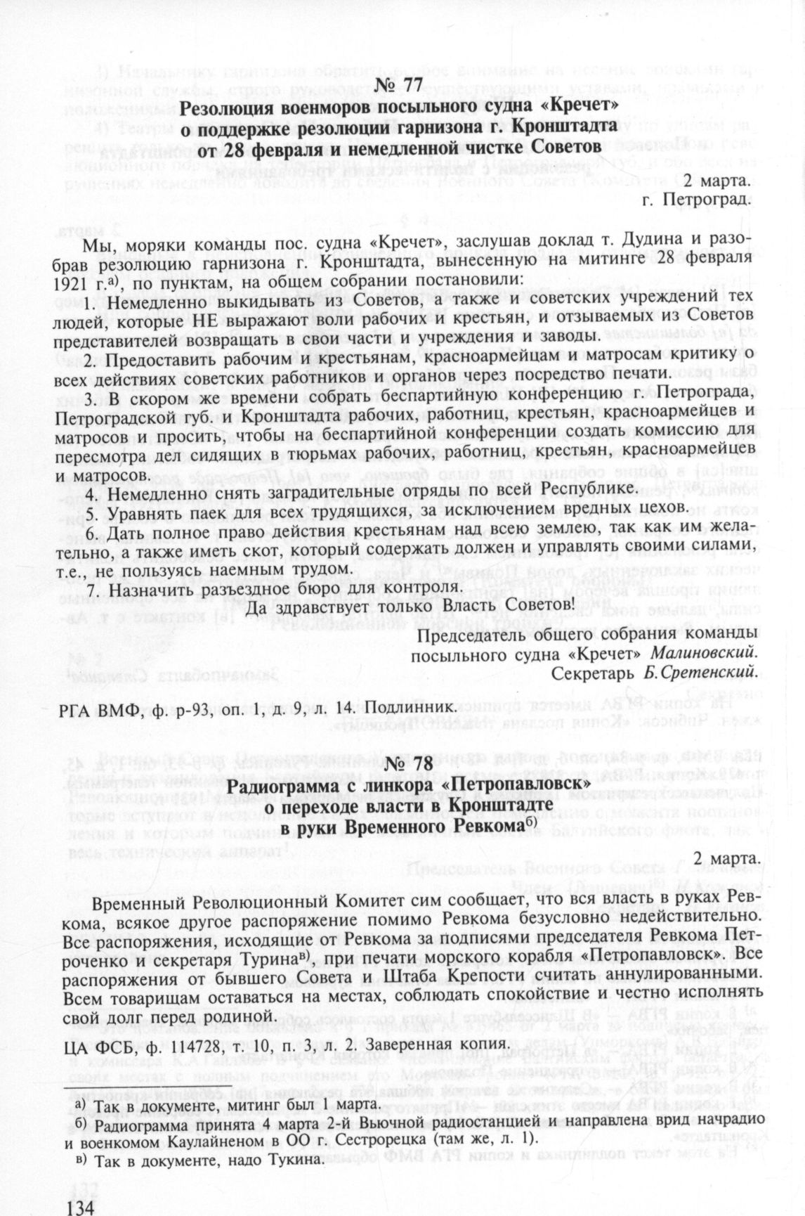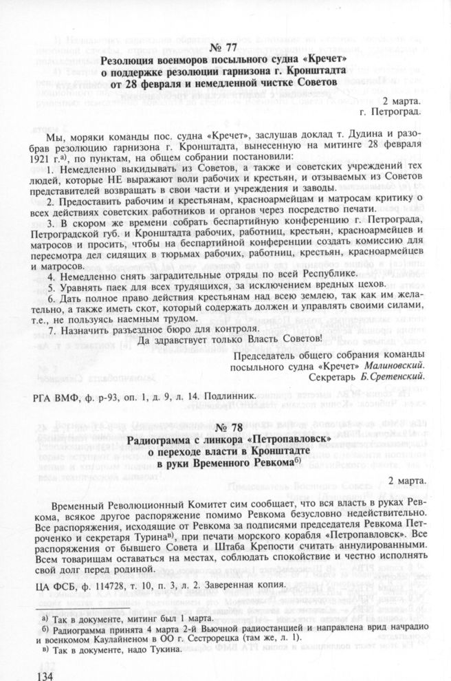 Резолюция военморов посыльного судна «Кречет» о поддержке резолюции гарнизона г. Кронштадта от 28 февраля и немедленной чистке Советов. 2 марта // РГА ВМФ, ф. р-93, оп. 1, д. 9, л. 14. Подлинник.