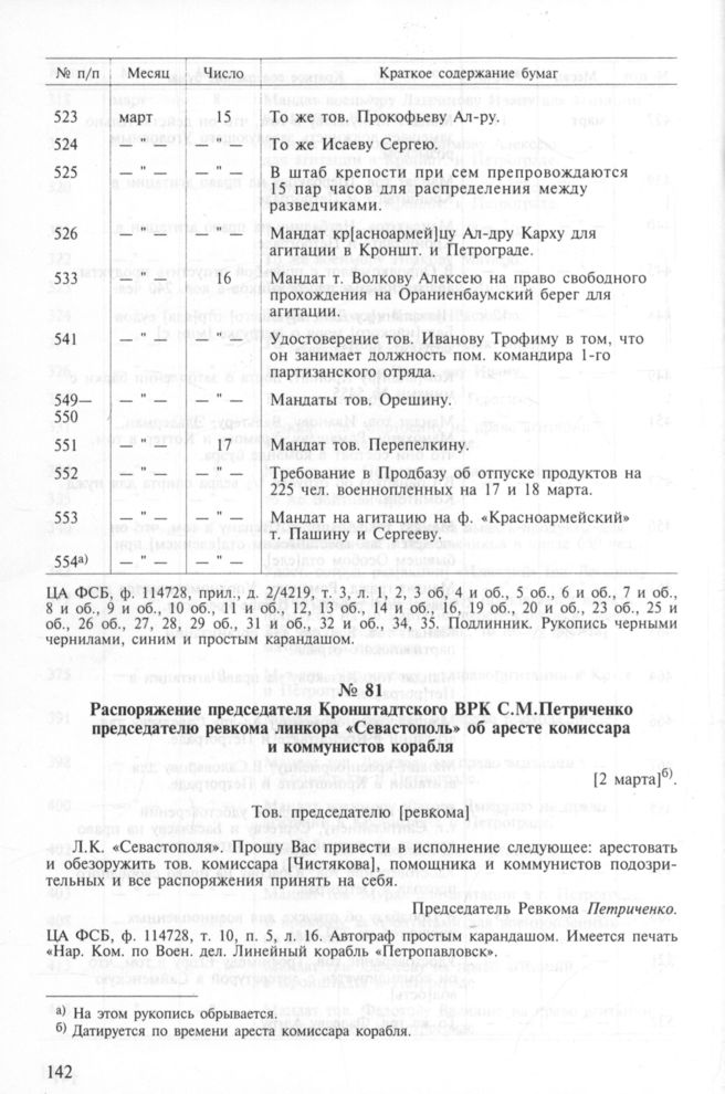 Распоряжение председателя Кронштадтского ВРК С.М. Петриченко председателю ревкома линкора «Севастополь» об аресте комиссара и коммунистов корабля. [2 марта] // ЦА ФСБ, ф. 114728, т. 10, п. 5, л. 16. Автограф простым карандашом. Имеется печать «Нар. Ком. по Воен. дел. Линейный корабль «Петропавловск».