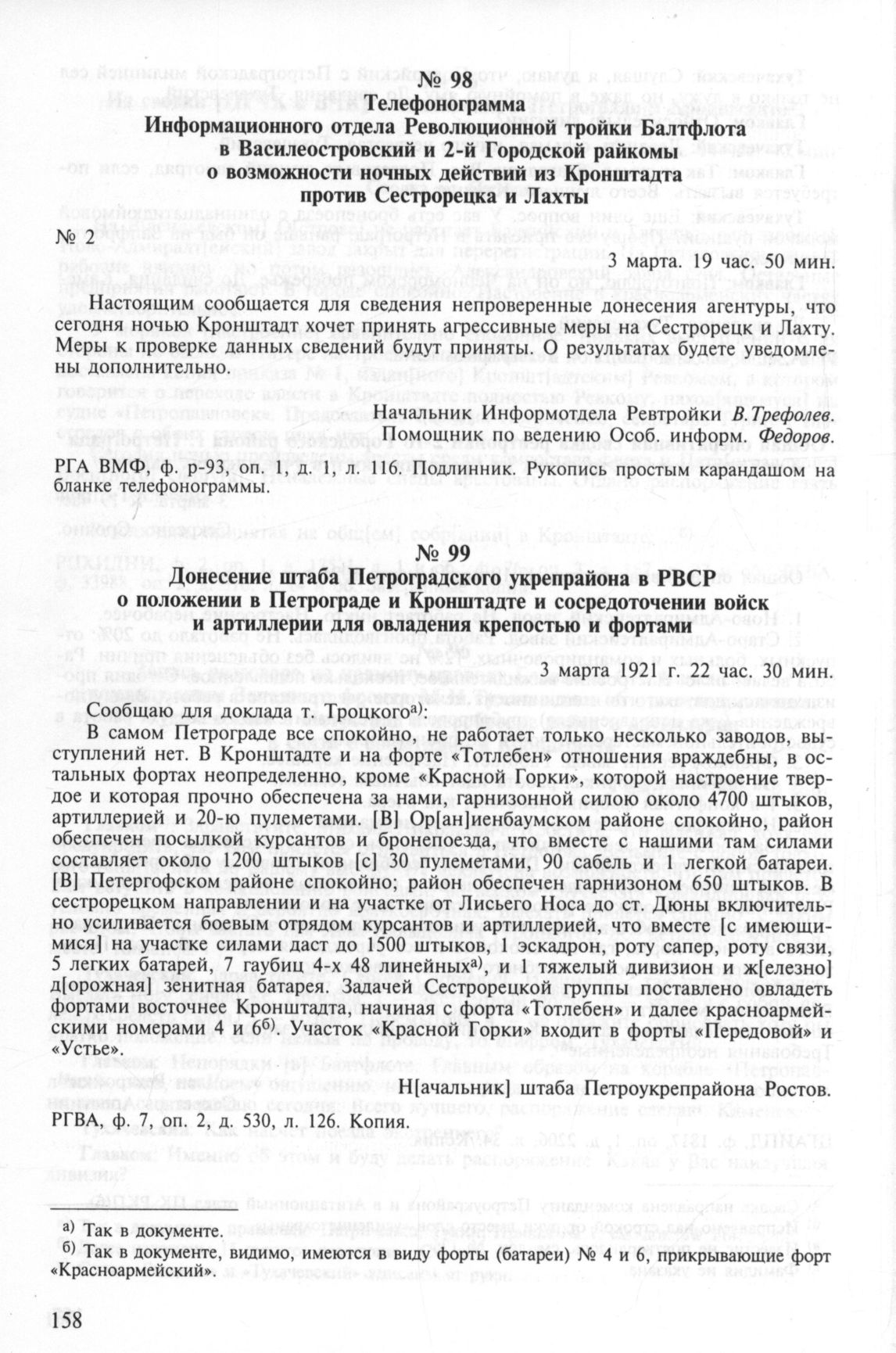 Донесение штаба Петроградского укрепрайона в РВСР о положении в Петрограде и Кронштадте и сосредоточении войск и артиллерии для овладения крепостью и фортами. 3 марта 1921 г. 22 час. 30 мин. // РГВА, ф. 7, оп. 2, д. 530, л. 126. Копия.