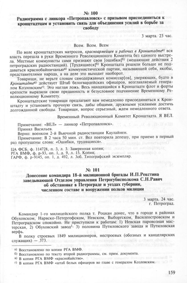 Радиограмма с линкора «Петропавловск» с призывом присоединиться к кронштадтцам и установить связь для объединения усилий в борьбе за свободу. 3 марта. 23 час. // ЦА ФСБ, ф. 114728, п. 3, л. 3. Заверенная копия; РГА ВМФ, ф. р-93, оп. 1, д. 9, л. 15. Копия; ГАРФ, ф. р-9145, оп. 1, д. 492, л. 3об. Типографский экземпляр.