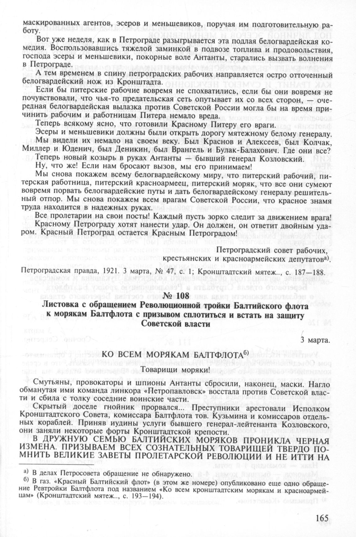 Листовка с обращением Революционной тройки Балтийского флота к морякам Балтфлота с призывом сплотиться и встать на защиту Советской власти. 3 марта // РГВА, ф. 33988, оп. 2, д. 368, л. 517; ф. 7, оп. 2, д. 530, л. 227; РГА ВМФ, ф. р-93, оп. 1, д. 1, л. 5. Типографские экземпляры. (Листовка отпечатана тиражом 10 тыс. экземпляров); Красный Балтийский флот. 1921. 5 марта. № 26 (251); Кронштадтский мятеж..., с. 192-193.