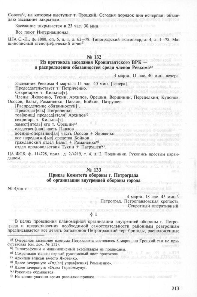 Приказ Комитета обороны г. Петрограда об организации внутренней обороны города. 4 марта. 18 час. 45 мин. // РГВА, ф. 190, оп. 3, д. 513, л. 4 и об. Подлинник; ЦГАИПД, ф. 16, оп. 1, д. 4089, л. 4-5; ф. 3631, оп. 2, д. 38, л. 4 и об. Заверенные копии.