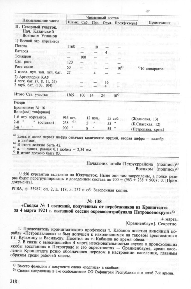 Сводка № 1 сведений, полученных от перебежчиков из Кронштадта за 4 марта 1921 г. выездной сессии окреввоентрибунала Петровоенокруга. 4 марта // ЦА ФСБ, ф. 114728, т. 9, л. 2. Подлинник; РГВА, ф. 190, оп. 3, д. 792, л. 2. Заверенная копия.