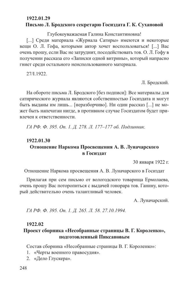 Отношение Наркома Просвещения А. В. Луначарского в Госиздат. 30 января 1922 г. // ГА РФ. Ф. 395. Оп. 1. Д. 265. Л. 58. 27.10.1994.