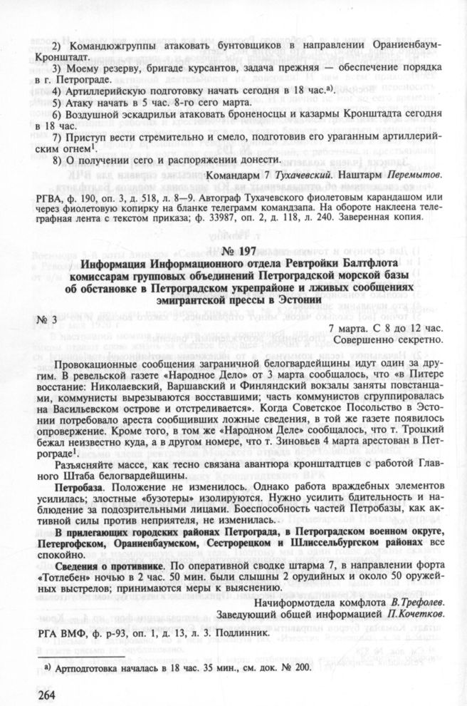 Информация Информационного отдела Ревтройки Балтфлота комиссарам групповых объединений Петроградской морской базы об обстановке в Петроградском укрепрайоне и лживых сообщениях эмигрантской прессы в Эстонии. 7 марта. С 8 до 12 час. // РГА ВМФ, ф. р-93, оп. 1, д. 13, л. 3. Подлинник.