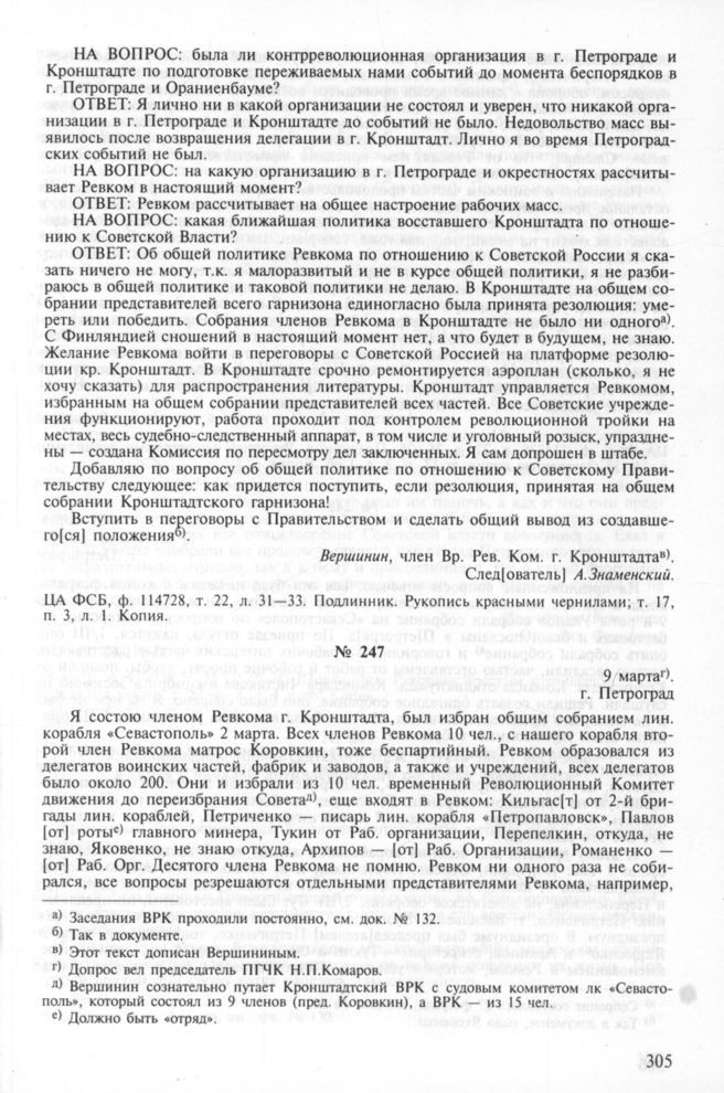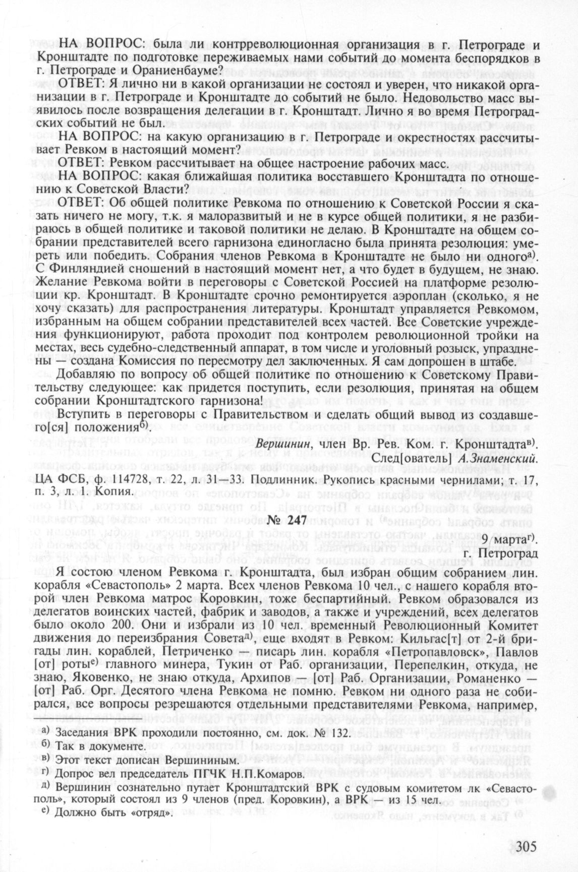 Протоколы допросов члена Кронштадтского ВРК С.С. Вершинина. 9 марта // ЦА ФСБ, ф. 114728, т. 22, л. 36-38. Подлинник. Рукопись фиолетовыми чернилами; л. 34-35. Заверенная копия; т. 17, п. 3, л. 1 об. Копия.
