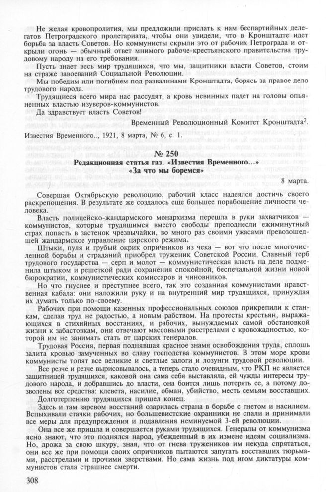 Редакционная статья газ. «Известия Временного Революционного Комитета матросов, красноармейцев и рабочих г. Кронштадта» «За что мы боремся». 8 марта // Известия Временного Революционного Комитета матросов, красноармейцев и рабочих г. Кронштадта, 1921, 8 марта, № 6, с. 1-2.