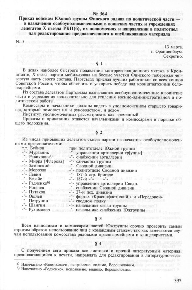 Приказ войскам Южной группы Финского залива по политической части — о назначении особоуполномоченными в воинских частях и учреждениях делегатов X съезда РКП(б), их полномочиях и направлении в политотдел для редактирования предназначенного к опубликованию материала. 13 марта // РЦХИДНИ, ф. 74, оп. 2, д. 79, л. 5 с об. Типографский экземпляр.